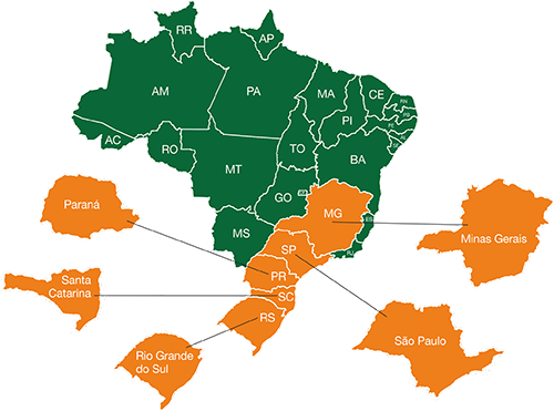 Nos estados de São Paulo, Minas Gerais, Paraná, Santa Catarina e Rio Grande do Sul.